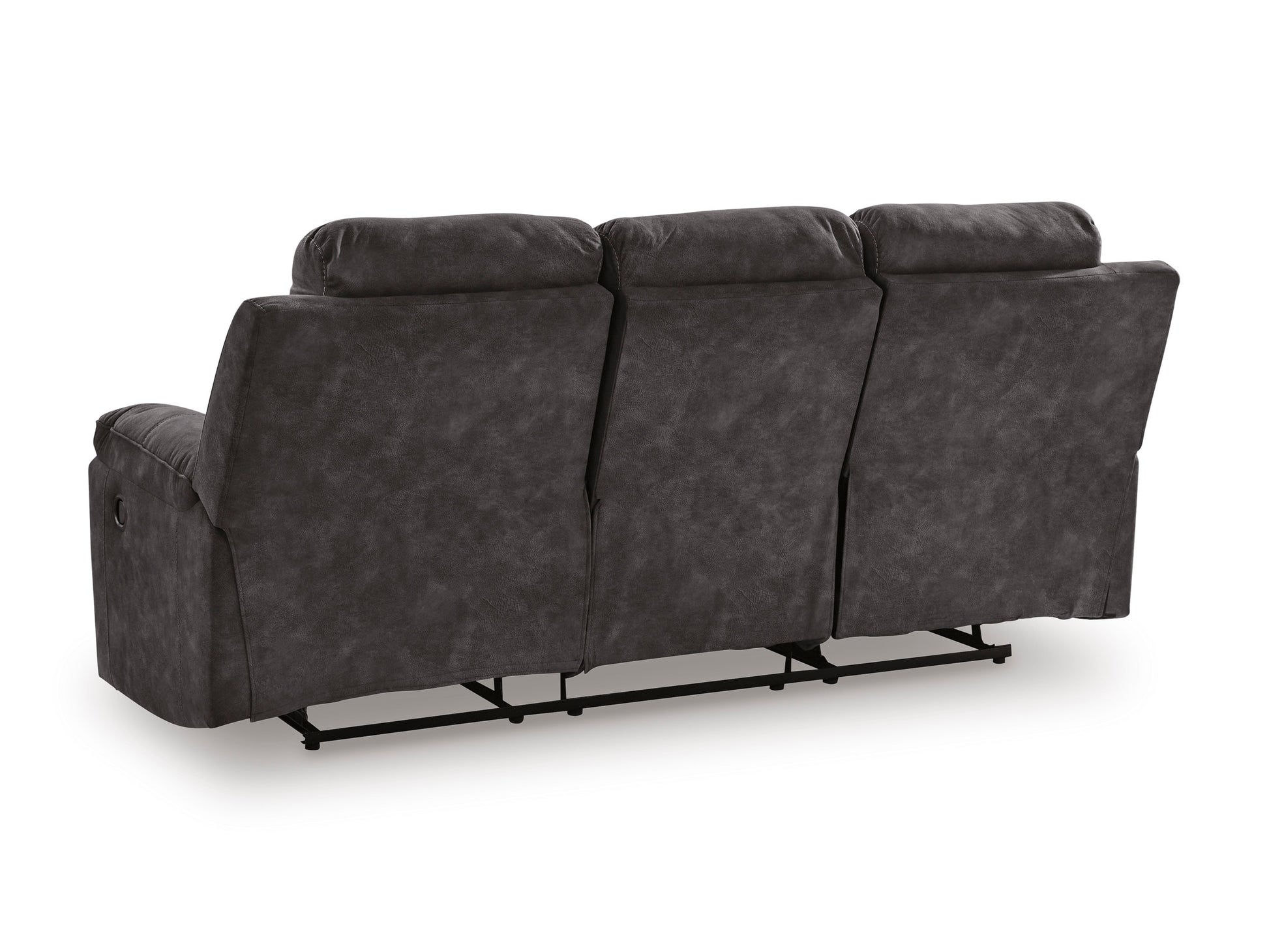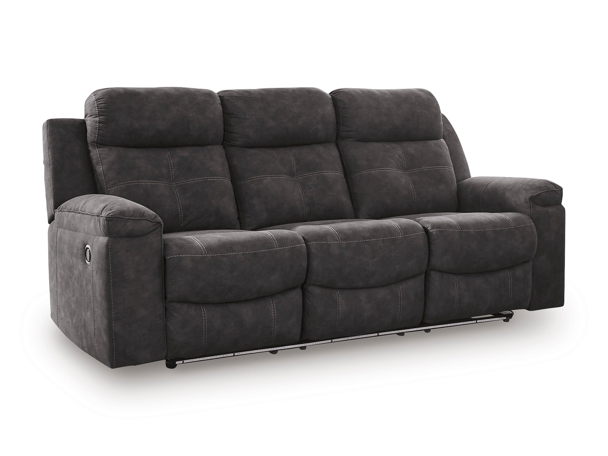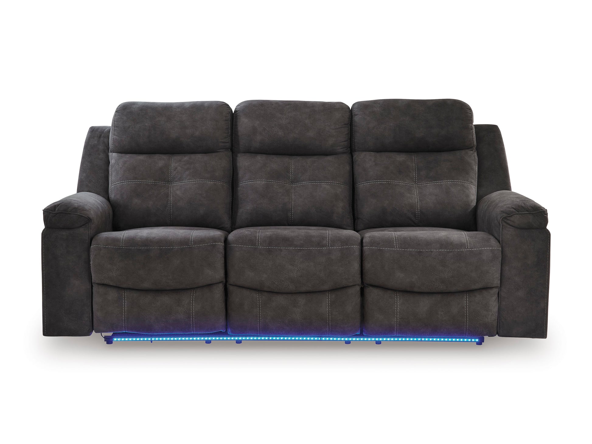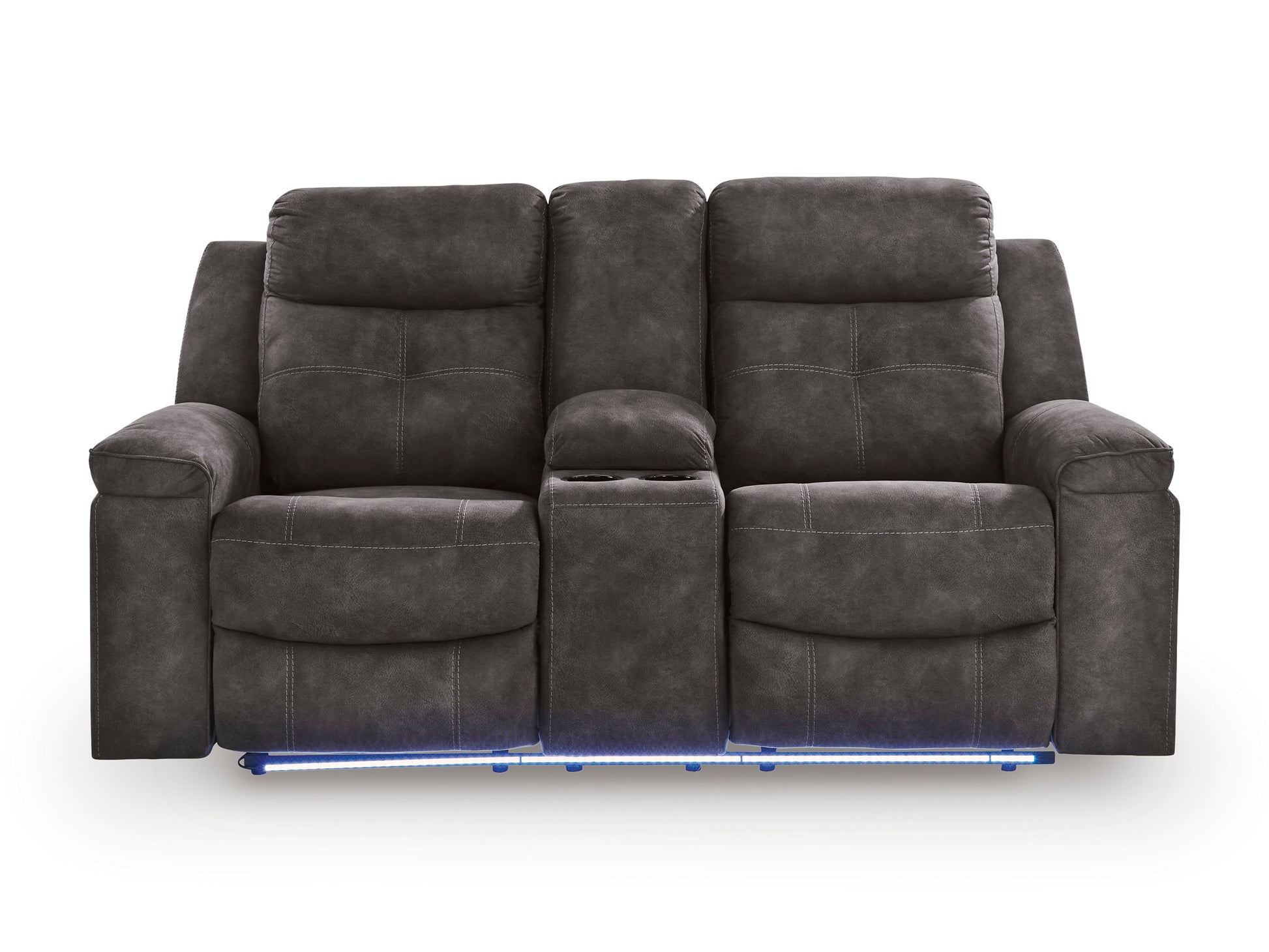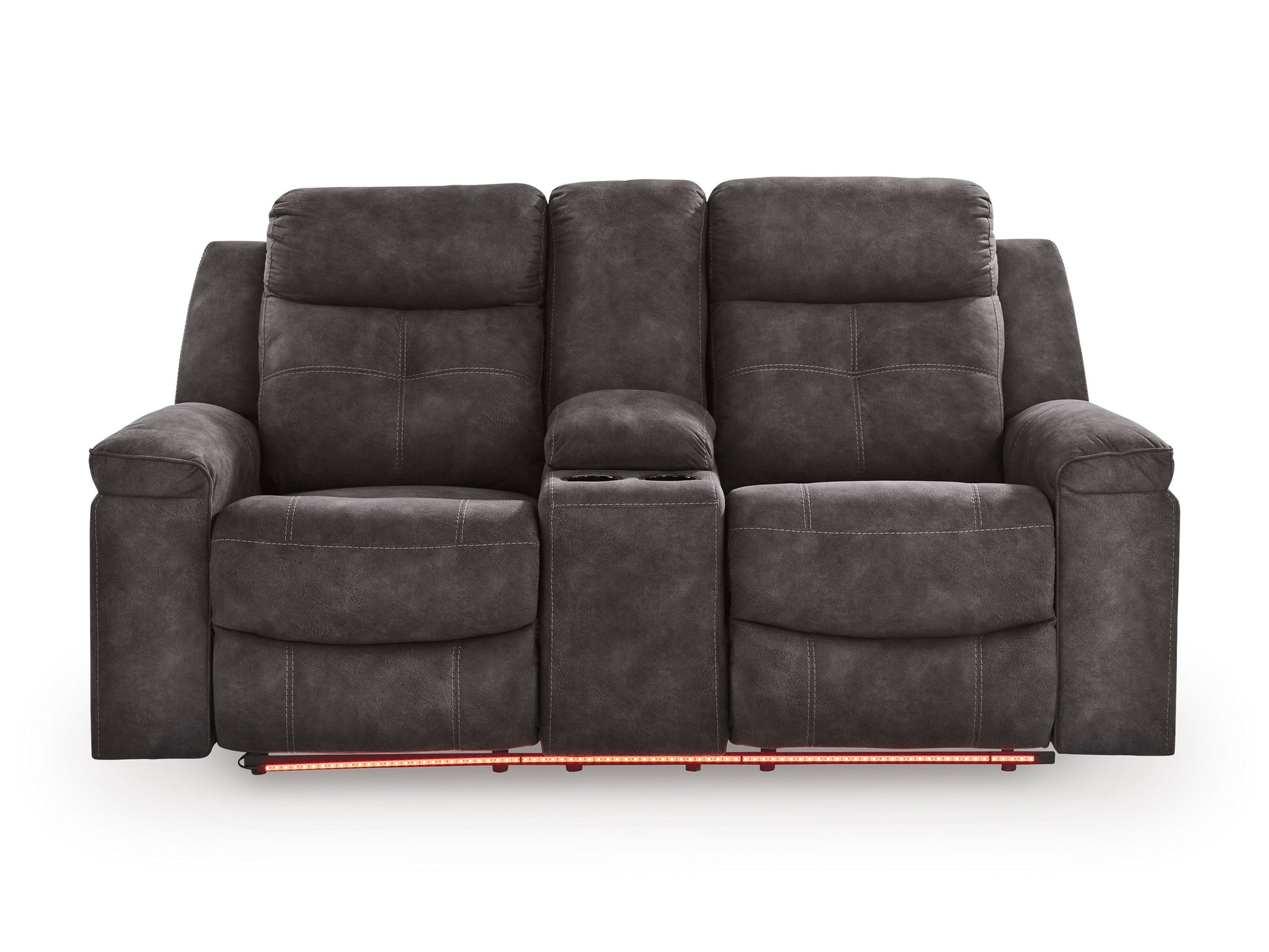 Seamlessly blend contemporary aesthetics and uncompromising comfort with this reclining loveseat. Its handsome charcoal-hued faux leather has a tailored appeal thanks to sizable stitching details. As for modern convenience? The simple one-pull reclining and ambient LED lighting encourage you to relax in style.