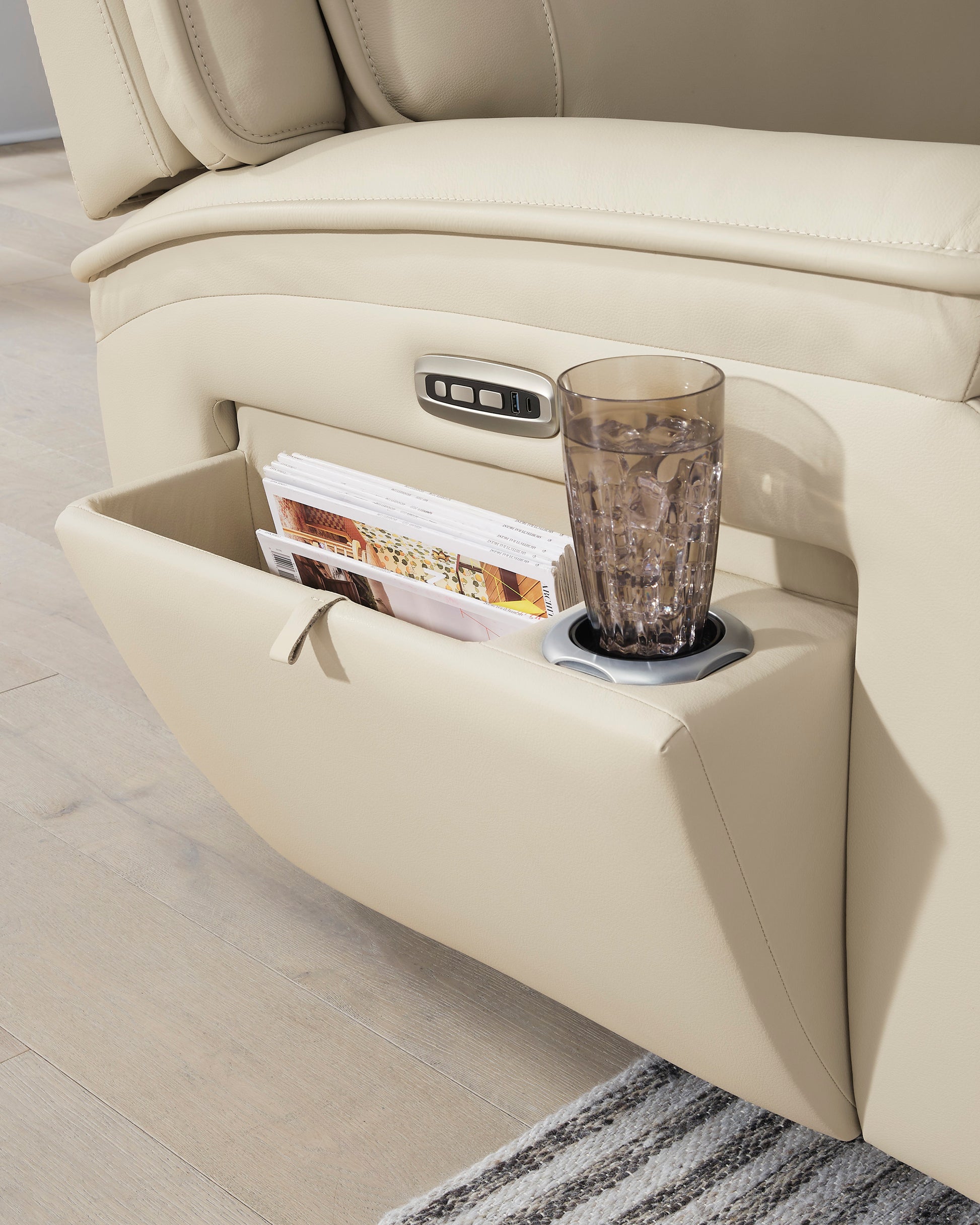 - Armrests with pop-out storage and cup holder