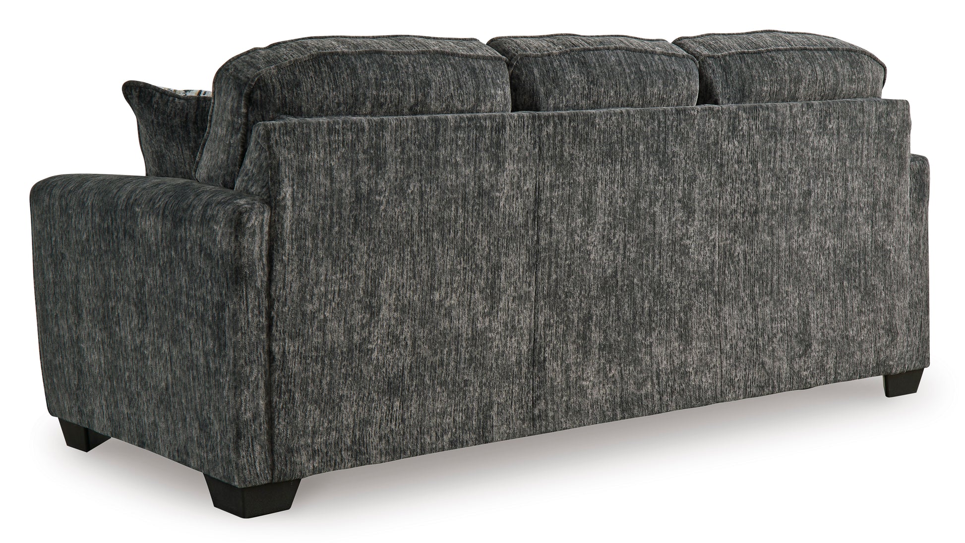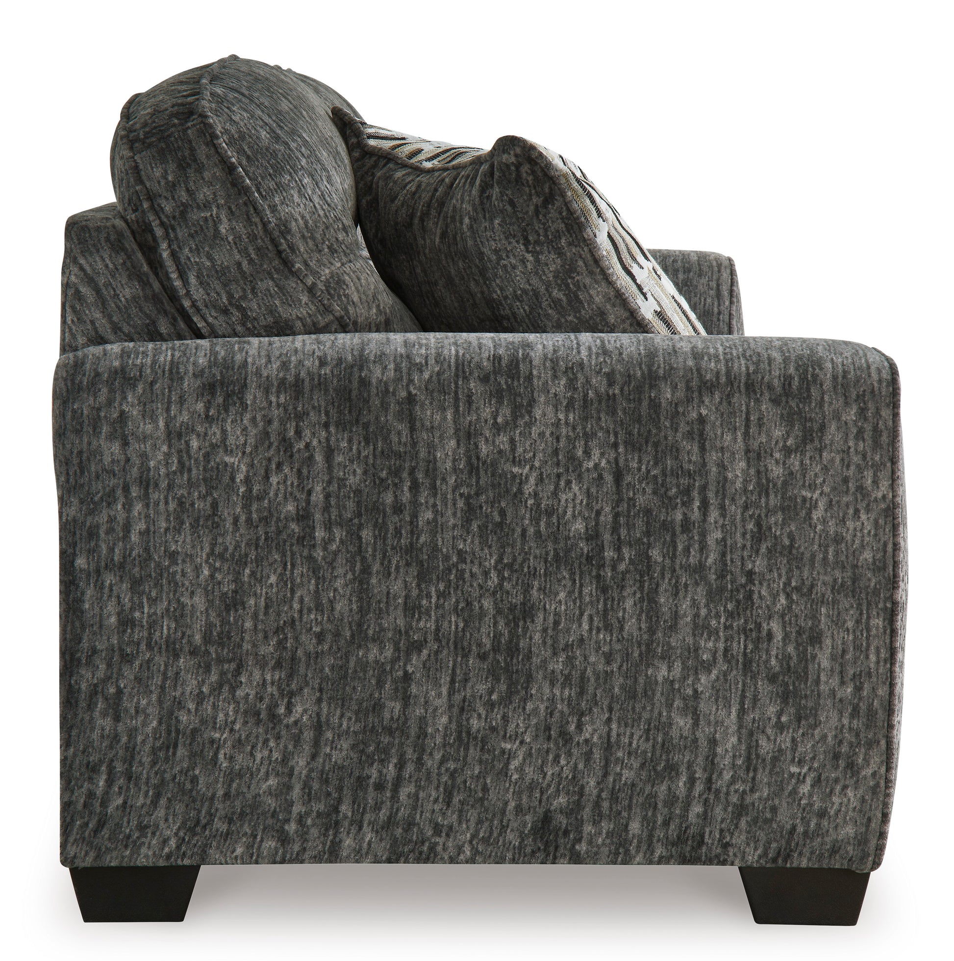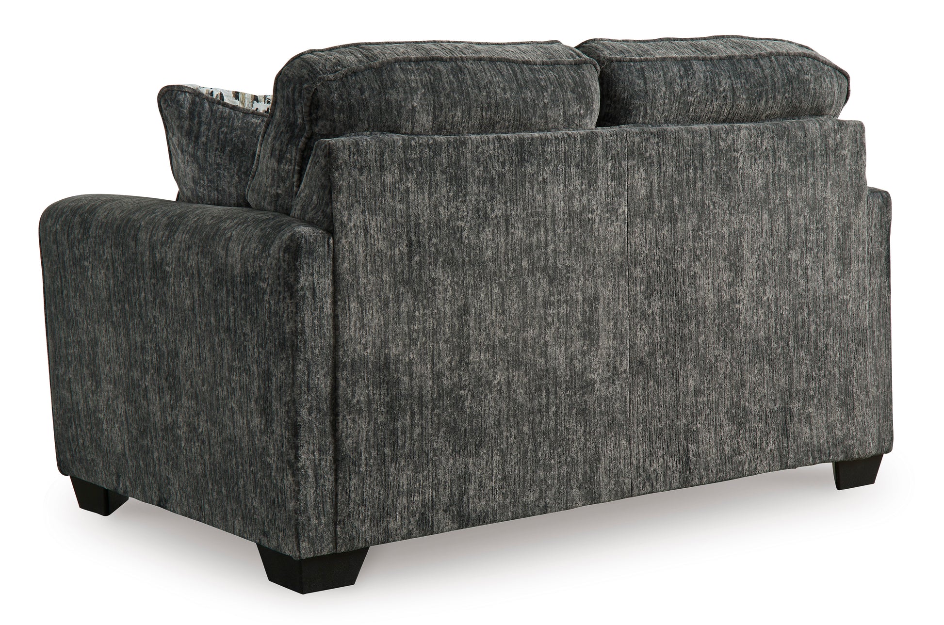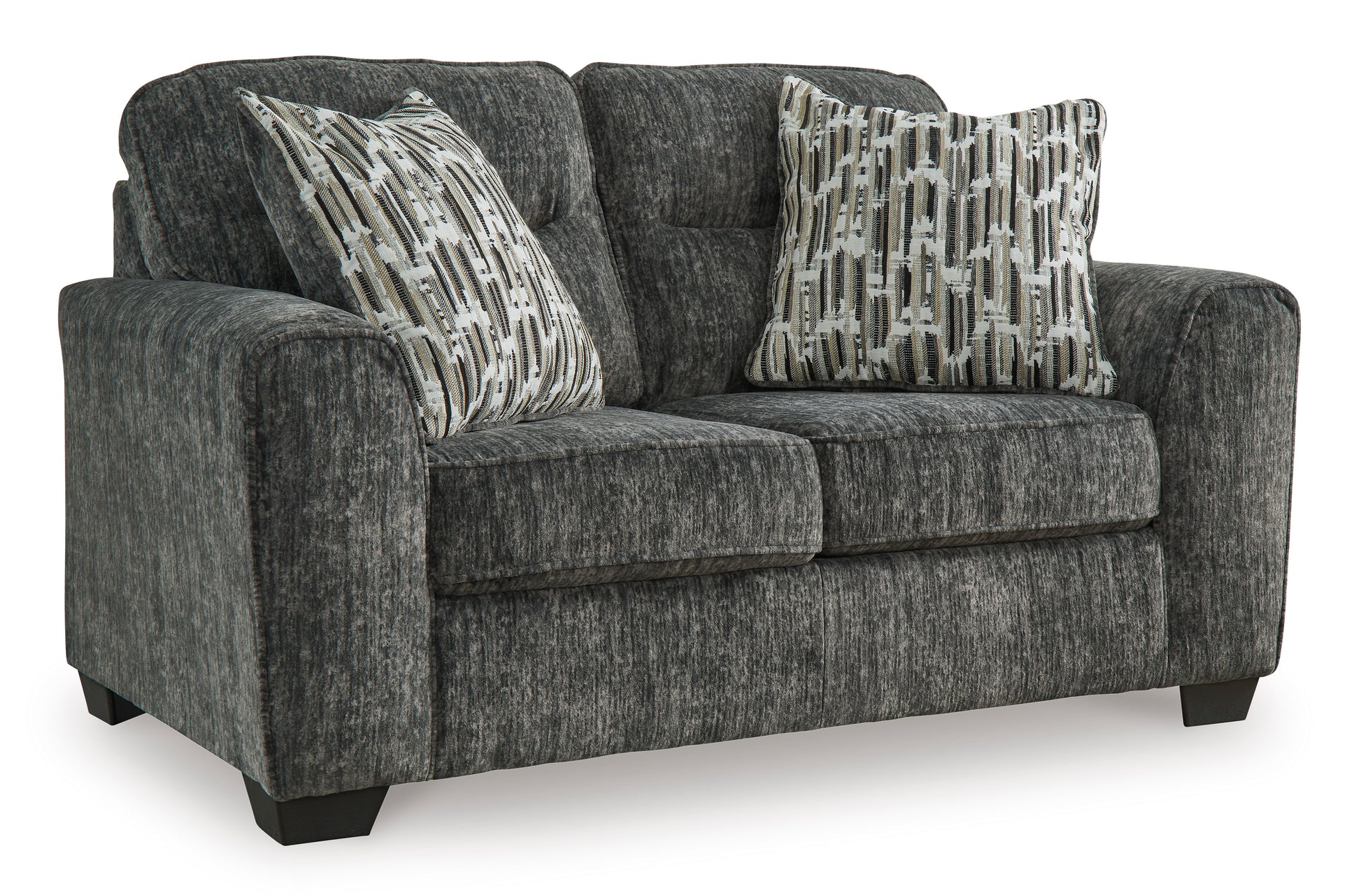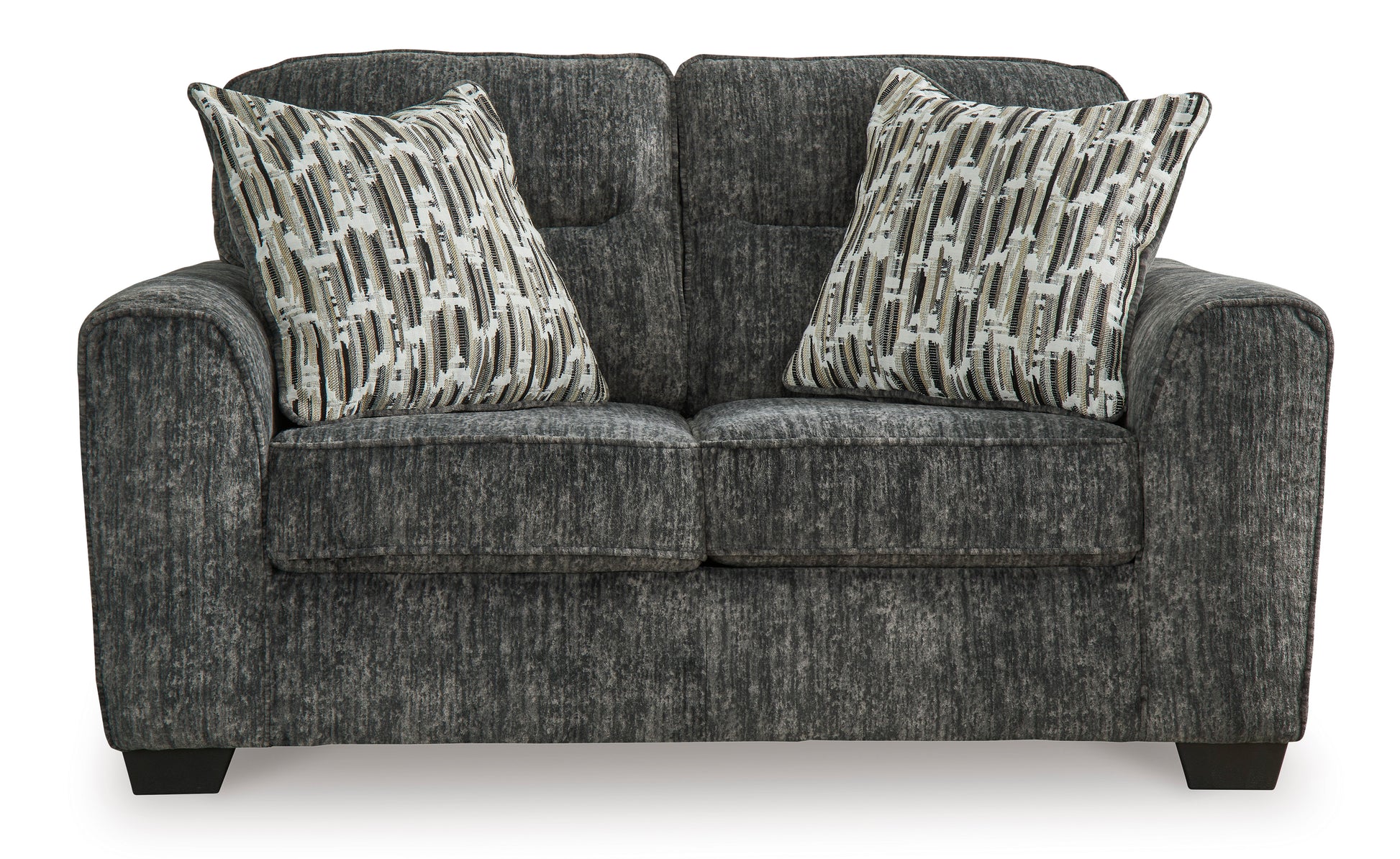The Lonoke loveseat speaks to those drawn to fresh, contemporary style with richly neutral appeal. Subtle and sophisticated, the plush upholstery and dark tri-block legs are a natural complement for so many color schemes. Two accent pillows make the seating even more welcoming. Curling up on this loveseat to enjoy a night in is never out of the question.