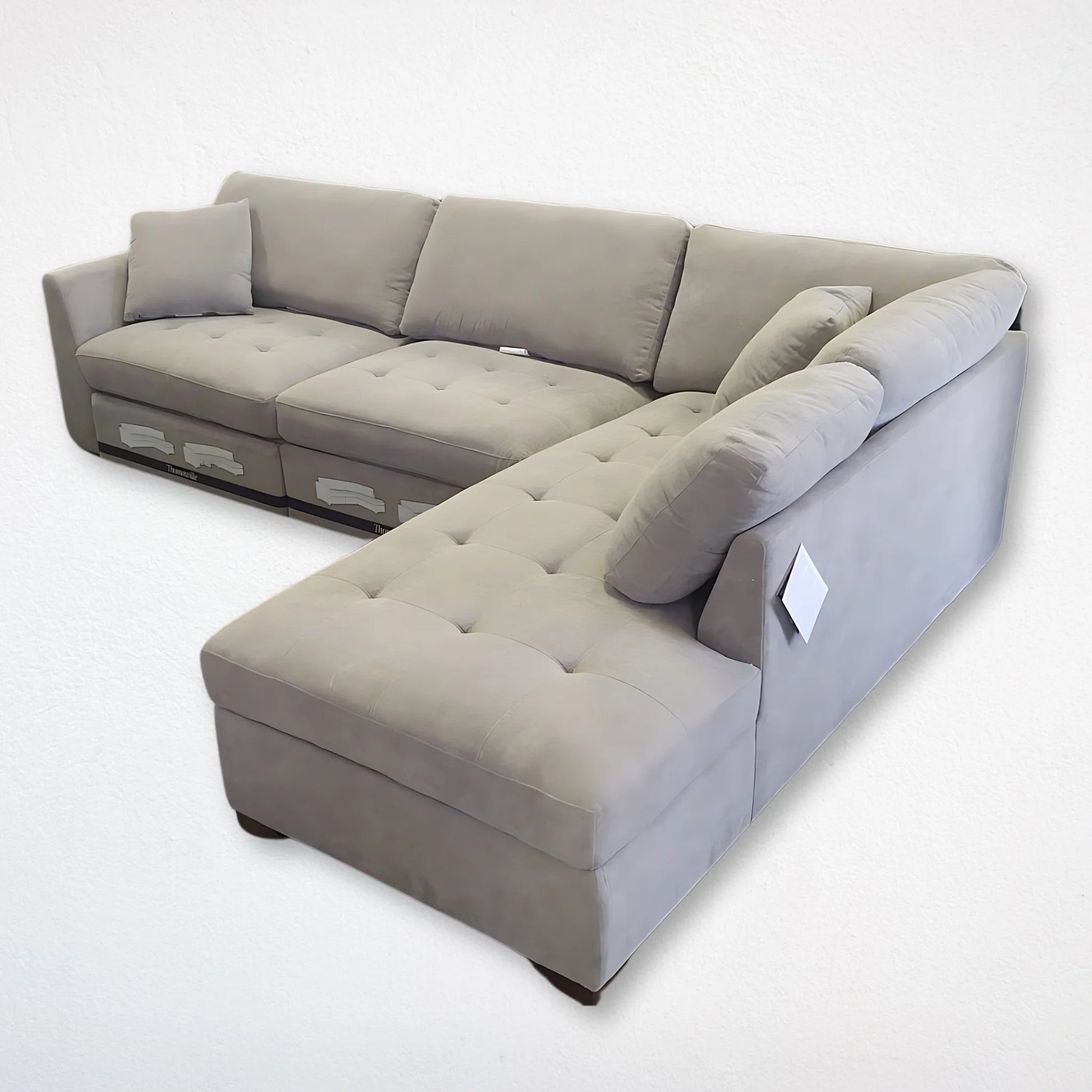 Experimente el máximo estilo y comodidad con el sofá modular de tela Thomasville Miles. Relájese en los cojines de asiento con mechones y ajústelos fácilmente a su gusto con dos reposapiés eléctricos. Los cojines del respaldo con cierre de cremallera facilitan la limpieza y el mantenimiento.