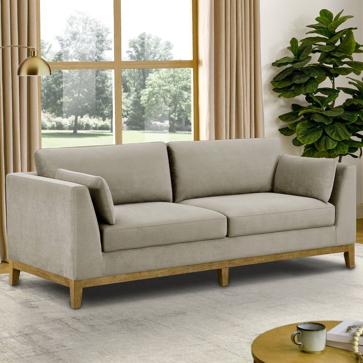Elevate your living space with the Thomasville Mokena Sofa. This Modern masterpiece features sleek wedge-shaped arms and solid wood trim for a sophisticated look. Covered in soft velvet fabric, it promises luxurious comfort, while the attached seat cushions provide firm support. The loose, reversible back cushions allow for easy refreshing. Hidden storage under the seat cushions keeps space tidy and organized. Two perfectly sized accent pillows offer additional comfort. The Mokena Sofa combines style, comfort, and function, making it the ideal choice for any modern home.
